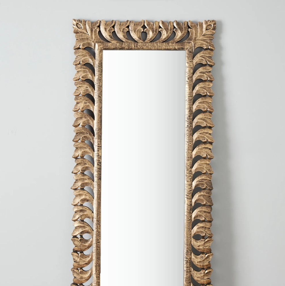 The Daphne doesn’t just reflect; it captivates. Its centerpiece is a beautifully crafted rectangular mirror, but what truly sets it apart is the surrounding carved wooden border. This border, a masterpiece in itself, exquisitely mimics leaves curving outwards, breathing life and nature into its design. The intricacy of the carving, coupled with the organic motif, adds layers of depth and texture, making it more than just a functional piece—it becomes a living artwork.