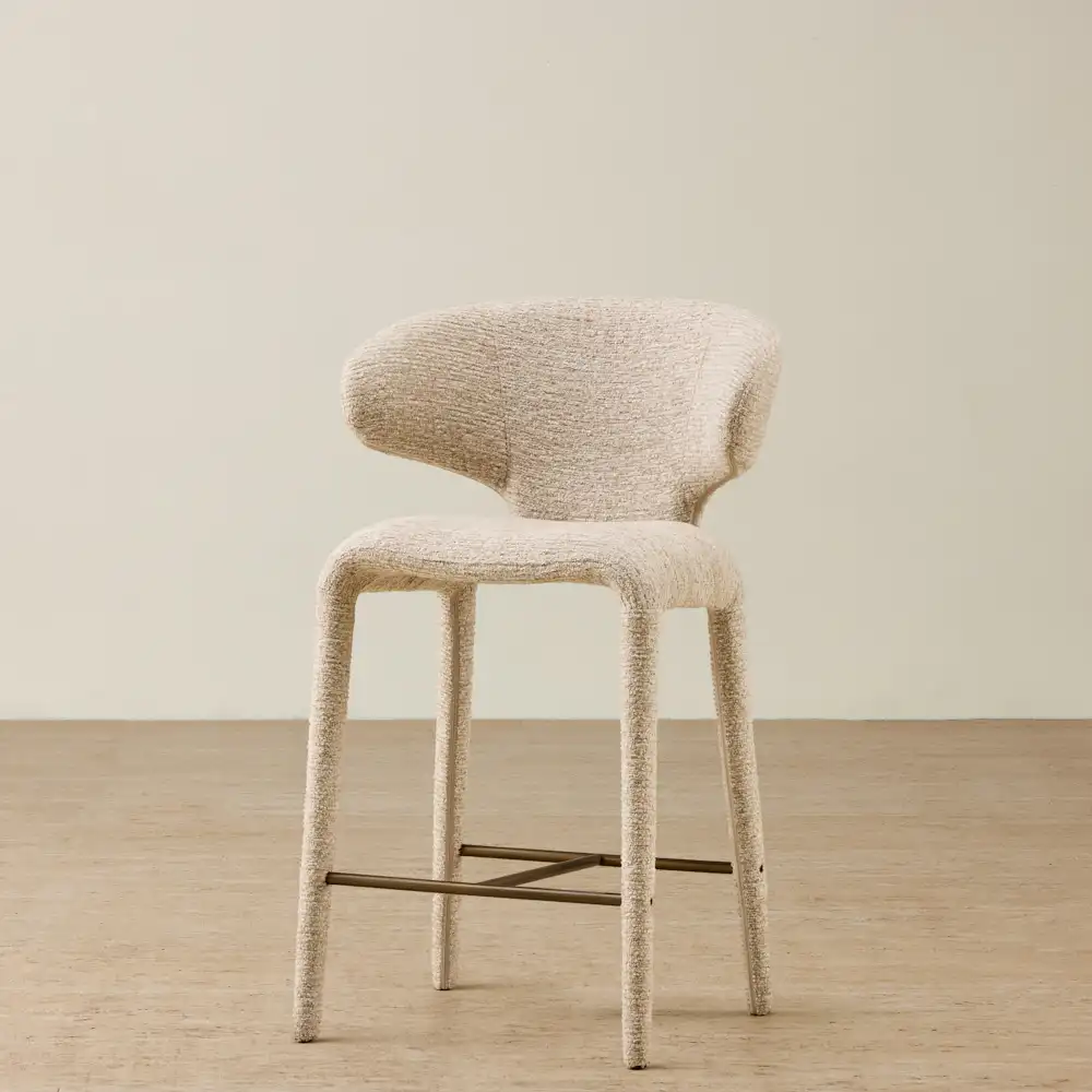 The structure remains compact and easy to place, offering a supportive seat suited to everyday use at kitchen counters and bar settings. A slim metal footrest runs between the legs, adding a subtle contrast while giving a natural place to settle.