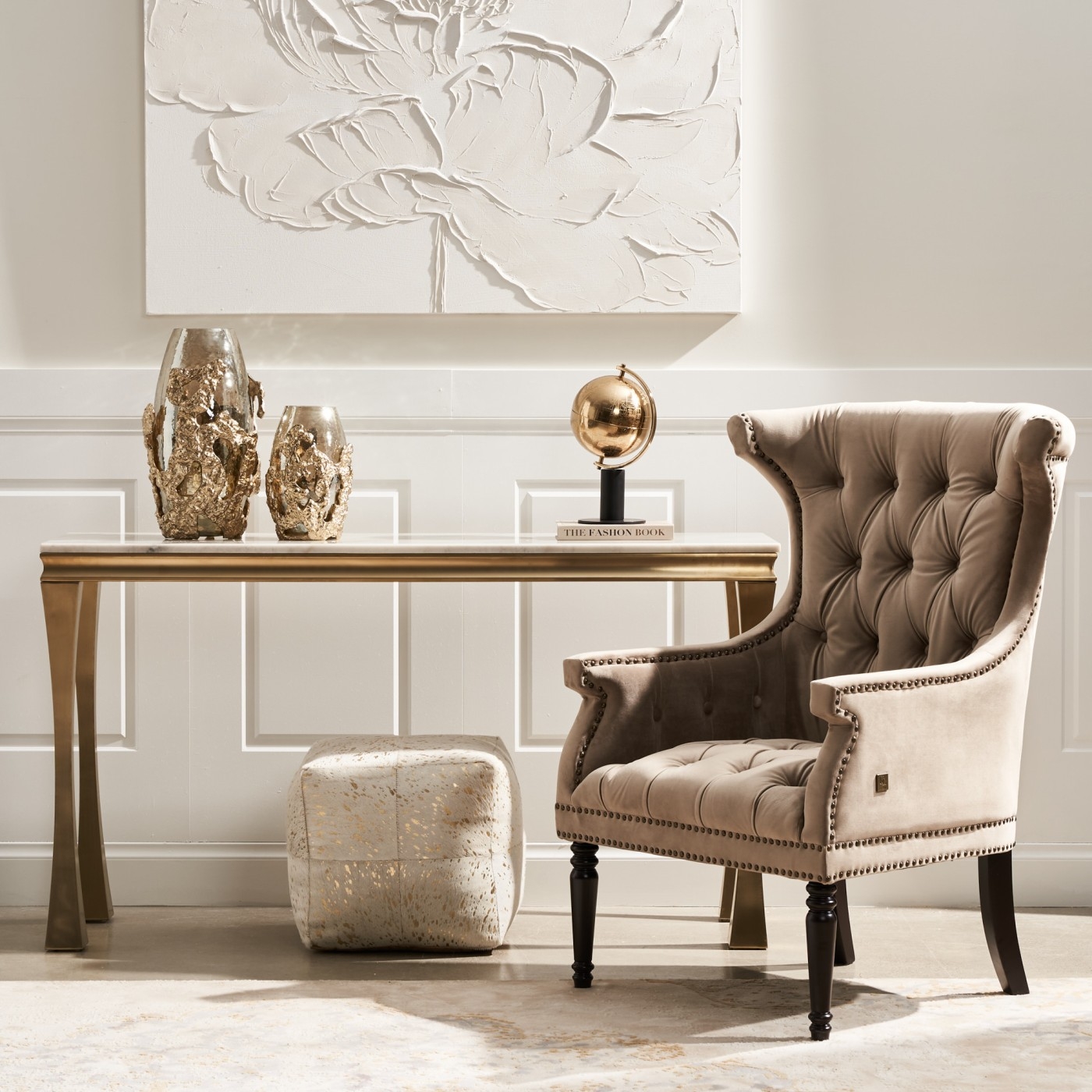 The Deco Beige Velvet Armchair brings luxury to any space with its wingback-inspired design and standout features. Its cushioned seat, upholstered in beige velvet with deep button tufting, offers a comfortable and stylish lounging experience.