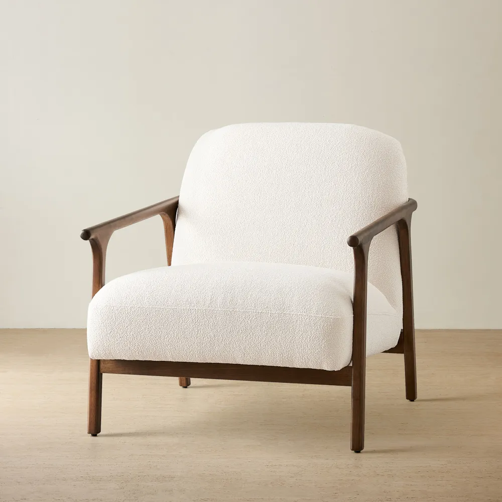 Balancing simplicity and presence, the Delphine’s sculpted wooden frame with slender arms highlights subtle detailing. Its smooth finish gives the chair both structure and timeless strength.