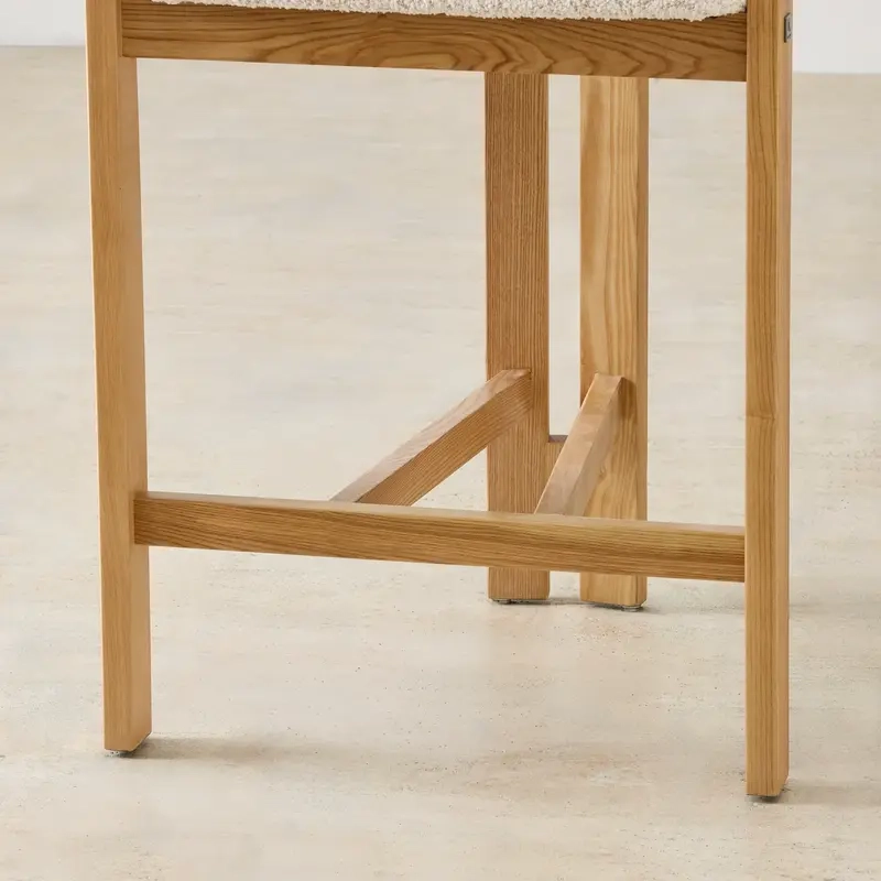 Framed with light brown ash legs, the design feels grounded and modern. The legs connect through a crossed support that becomes a natural footrest, creating both structure and an easy place to settle your feet.