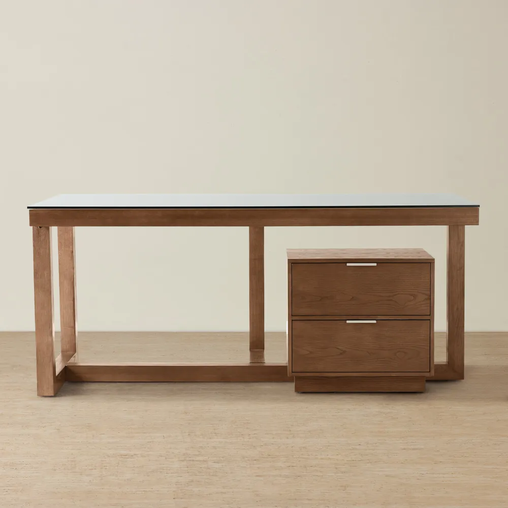 The Dorothy Desk combines classic materials with modern design for your home office. It features a glass tabletop perched on a black wooden frame.