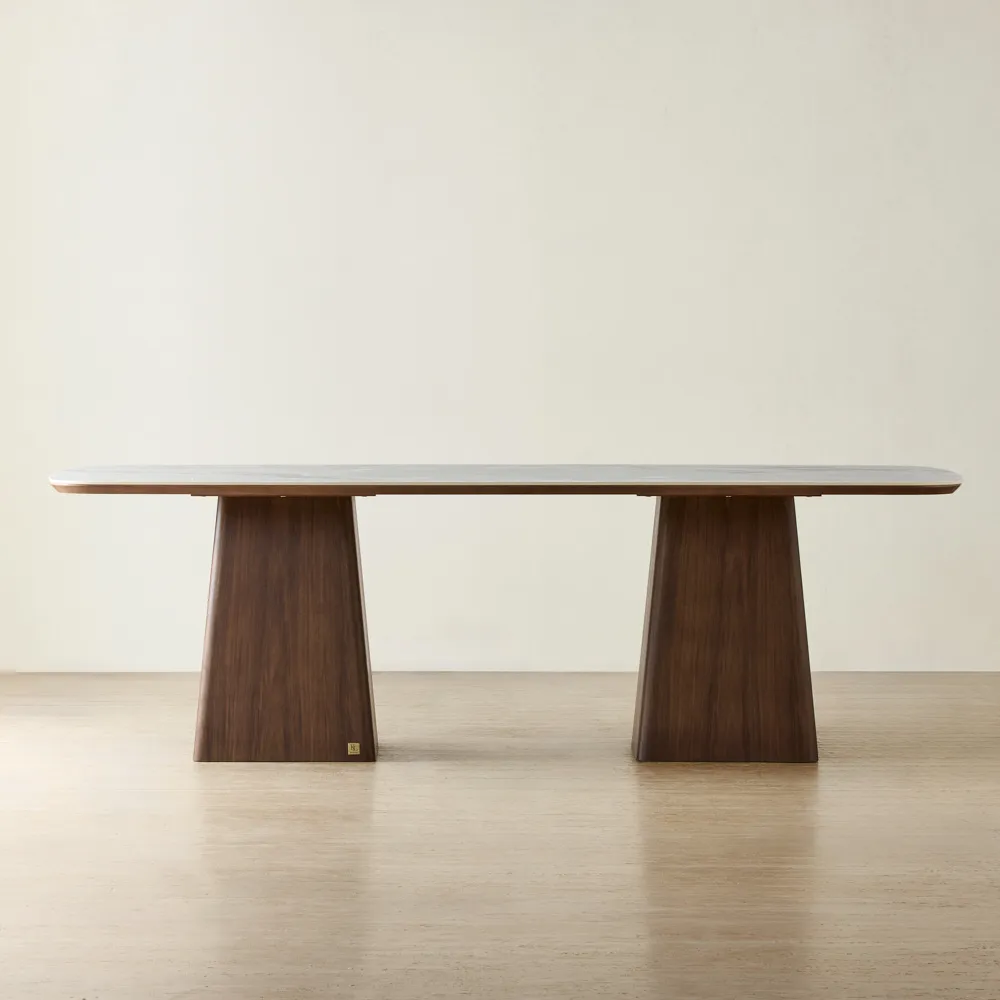 Its two column-shaped, geometrical wooden legs are beautifully crafted, adding sculptural interest and sturdy support. This dining table serves as a standout centerpiece that elevates the dining experience.