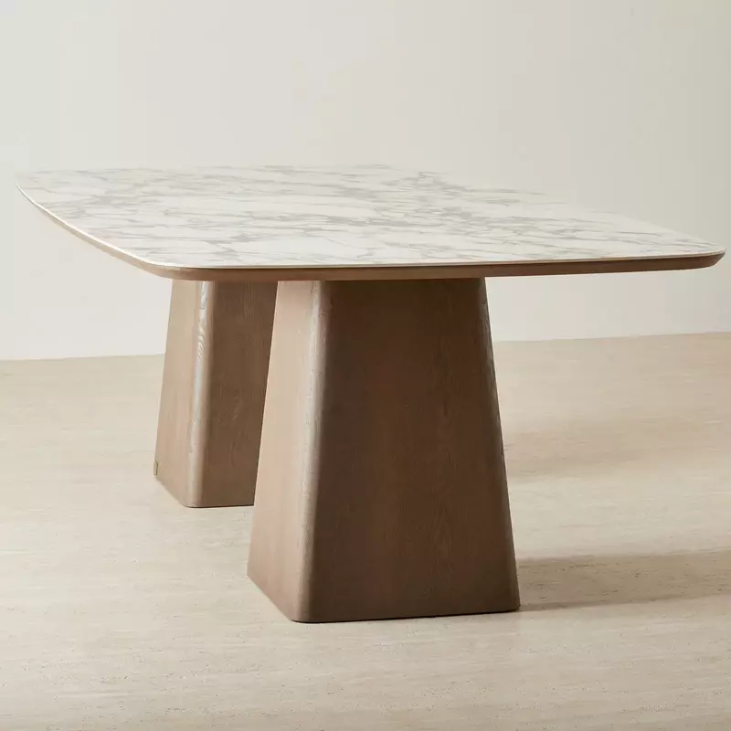 Its two column-shaped, geometrical wooden legs are beautifully crafted, adding sculptural interest and sturdy support. This dining table serves as a standout centerpiece that elevates the dining experience.