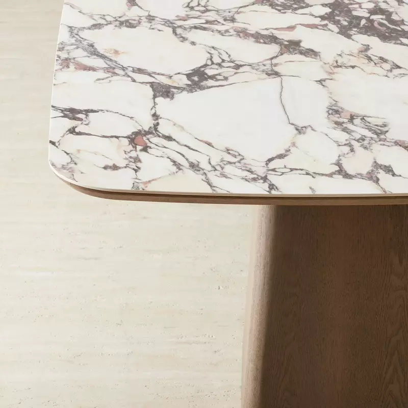The Dunstan Dining Table presents a striking rectangular form with curved edges that draw the eye with its refined surface. The rich veining of the sintered stone top creates an impression of timeless elegance, enhancing the dining space with visual depth.