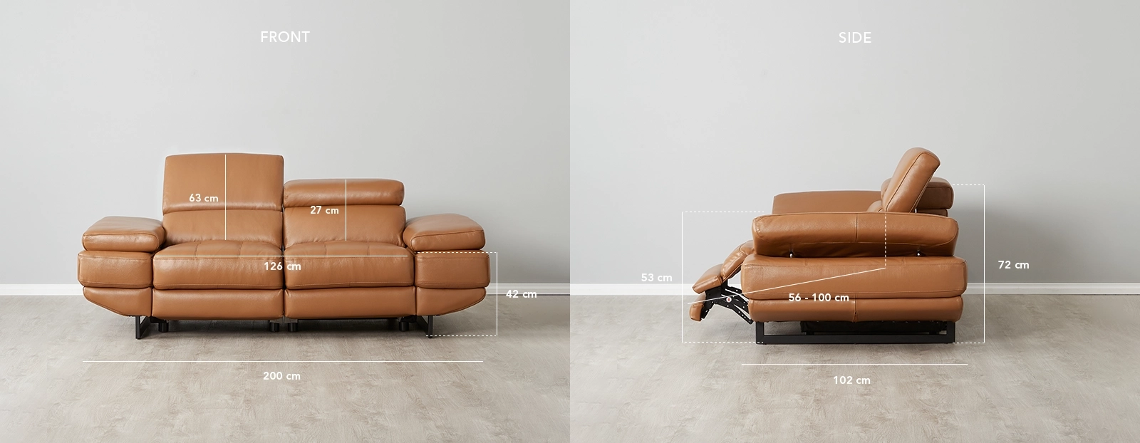 Feel the day's worries melt away as dense foam cushions cradle you, while Elena’s electric controls let you adjust the head and footrests with ease. For added comfort, the adjustable sides and discreetly integrated reclining mechanism offer a seamless, personalized relaxation experience.