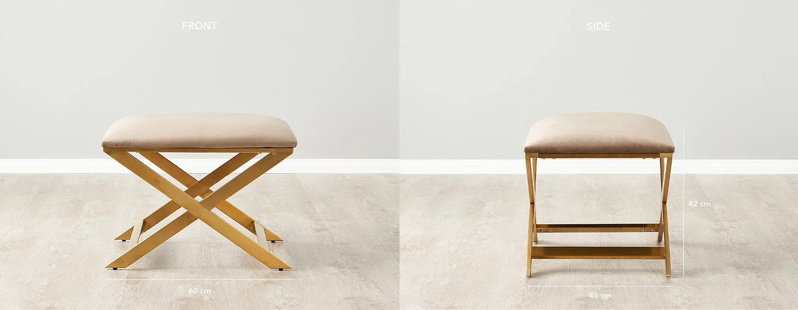The Elle Beige Velvet Ottoman is the epitome of understated elegance, blending plush comfort with a clean, contemporary design. Upholstered in a sumptuous beige velvet, its surface invites touch with a softness that promises luxury. This ottoman is gracefully supported by a crisscross base of gleaming gold-finished legs, their metallic sheen offering a striking contrast to the muted tone of the velvet.