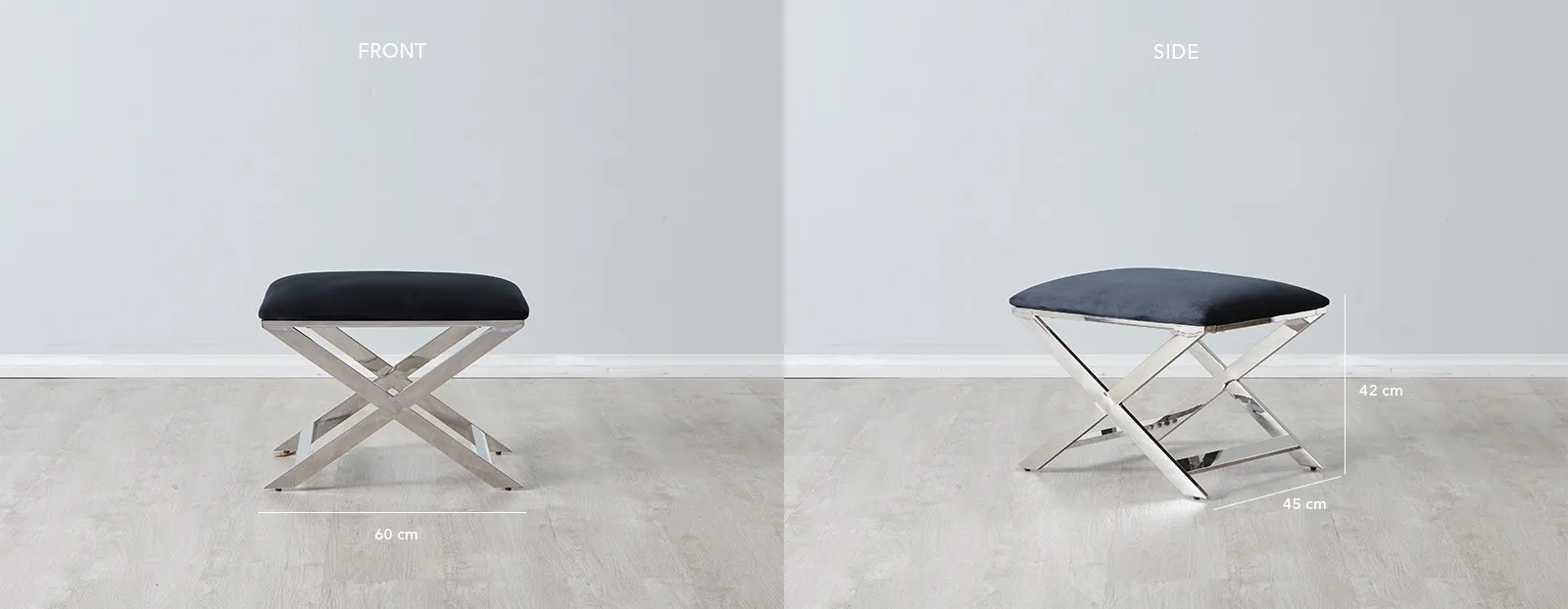 The Elle Ottoman combines style and versatility, making it a perfect addition to any space. Its luxurious dark velvet seat pairs elegantly with a fine-grade stainless steel frame, creating a classy aesthetic.