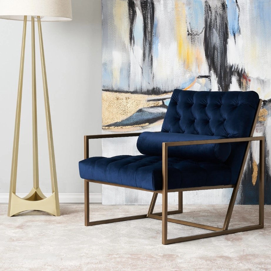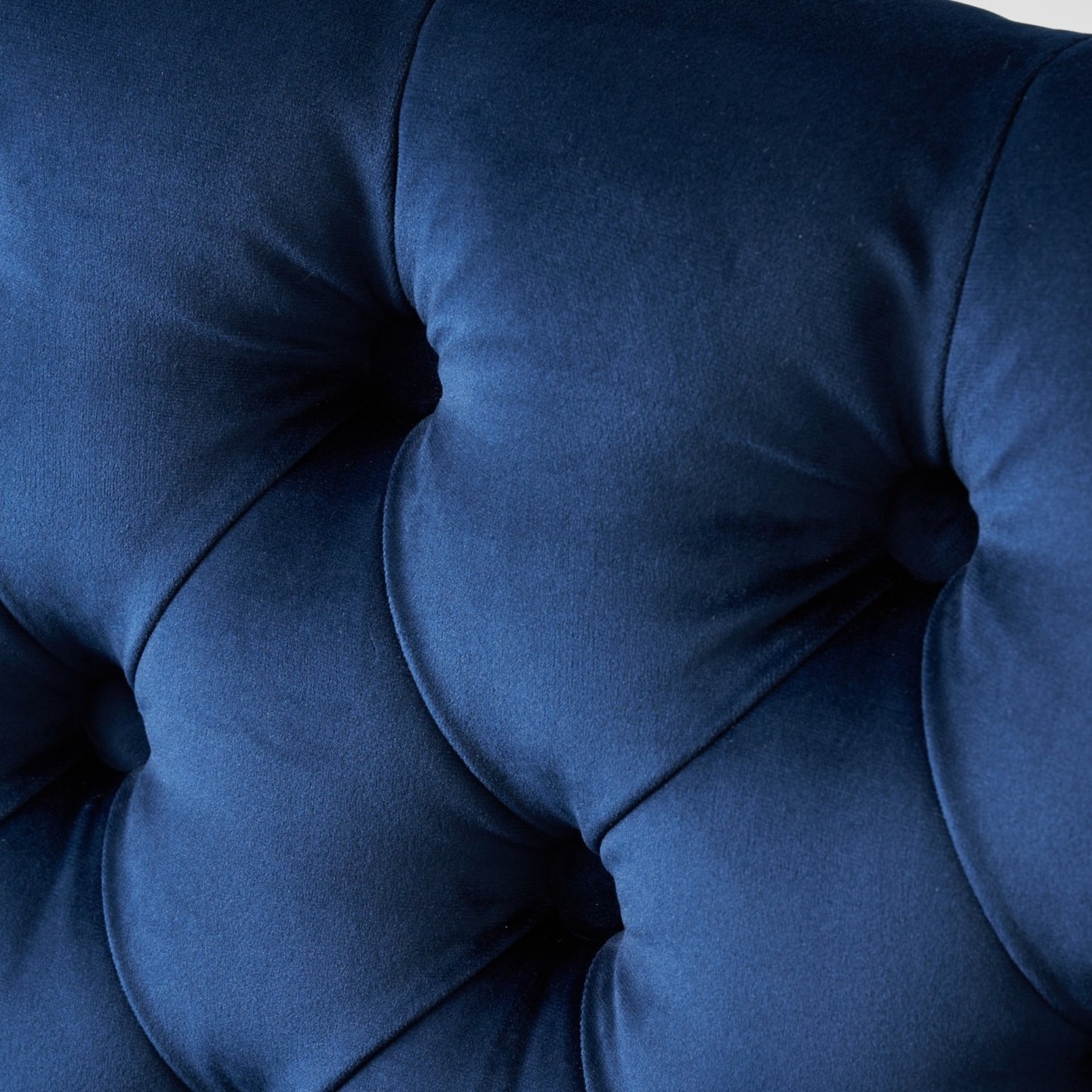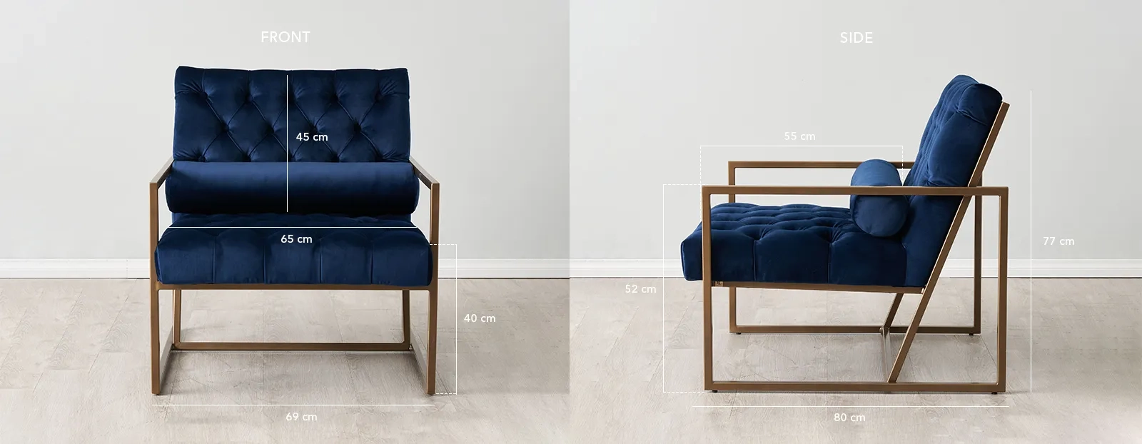 The Elliot Navy Blue Velvet Occasional Chair offers lasting comfort and style. Its back and seat cushions, upholstered in navy blue velvet, create a cosy and inviting feel.