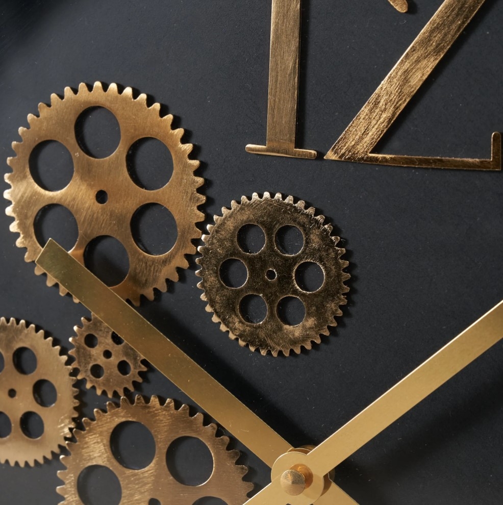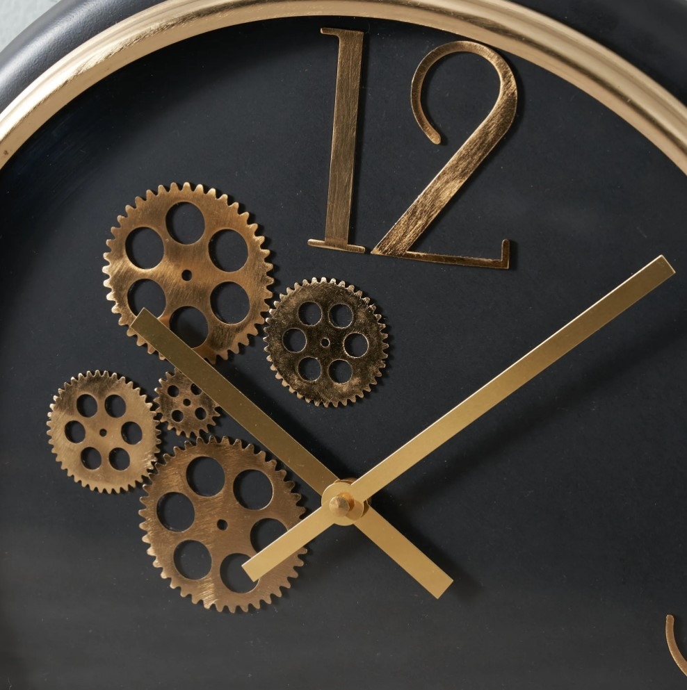 Write about the Elmer Clock. how it luxury to your home with a touch of whimsy in its design. This beautiful round metal clock. it features a black and gold aesthetic that instantly adds this and that to any room. it features a collection of decorative gears in one section while its numbers are 12 3 and 6 and wshat that entails, whimsical.