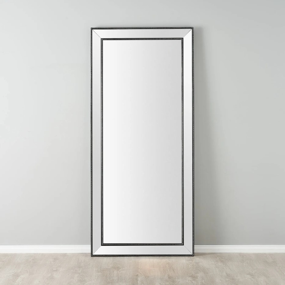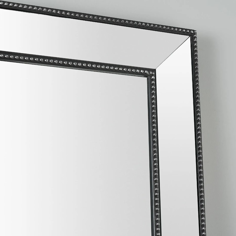 Framing this expansive reflective surface are the mirror's standout features: studded borders with inset mirrored panels that capture and refract light in a dazzling display. This studded detailing adds a touch of edginess and modern glamour, while the additional mirrored panels contribute to the mirror's luminous quality, bouncing light throughout the room to create a sense of openness and depth.