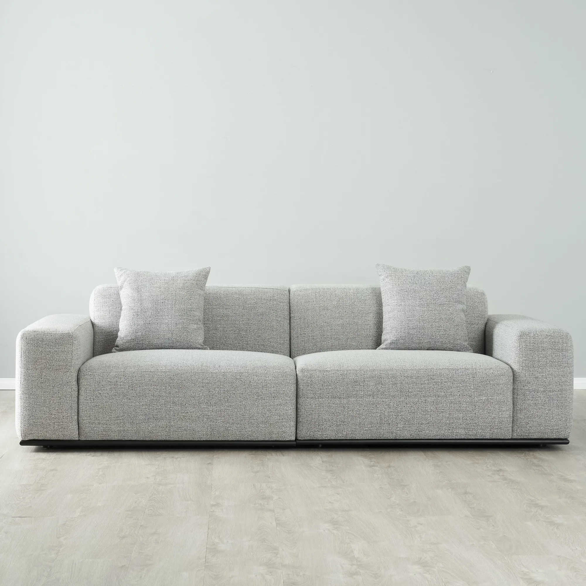 The Erica Mid Grey Woven Fabric 3-Seater Sofa features clean lines and a minimalist form. Its low profile and stocky design offer a comfortable, modern space for three.