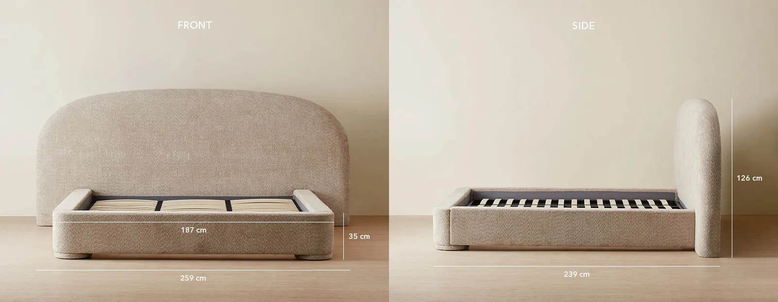 The Estelle Mid Beige Queen Bed stands out with its bold curved headboard, offering a striking focal point for your bedroom. Upholstered in stunning fabric, it brings a unique textured finish.