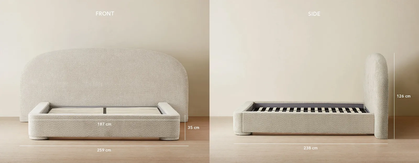 The Estelle Queen Bed stands out with its bold curved headboard, offering a striking focal point for your bedroom. Upholstered in stunning fabric, it brings a unique textured finish.