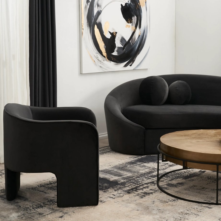 The Esther Charcoal Velvet Armchair combines modern design with a sleek charcoal velvet finish, offering both comfort and style. Its curved frame and open base design create a contemporary look that suits any space.