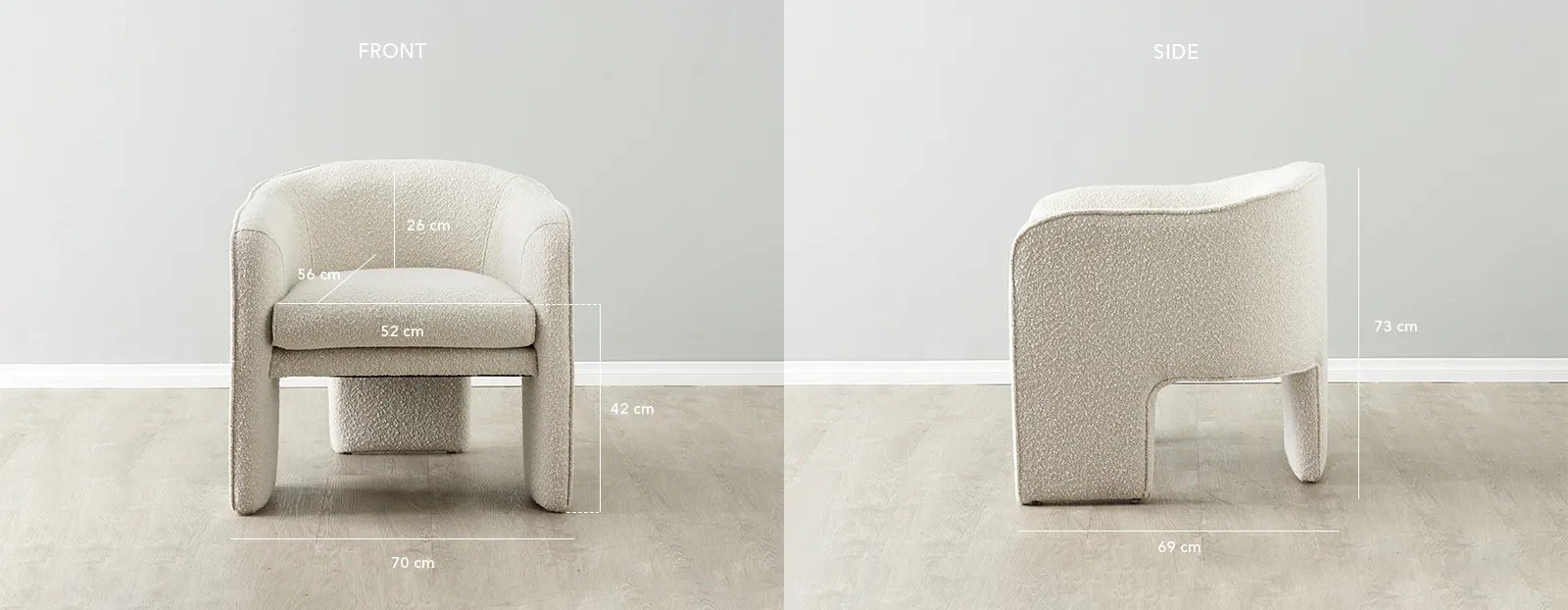 The Esther Cream Boucle Armchair's three-section frame provides stability and an open, modern look. Its timeless design makes it a versatile accent piece, perfect for pairing with a side table and floor lamp to create a cosy and inviting space.