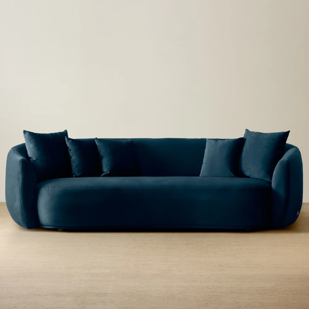 Its mid-century modern style showcases clean lines and subtle curves, with an inward curving frame that adds a unique touch, complemented by matching cushions in the same luxurious fabric.