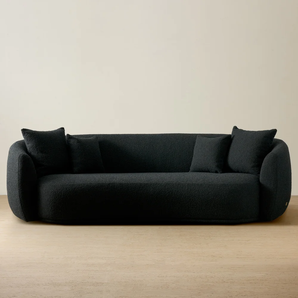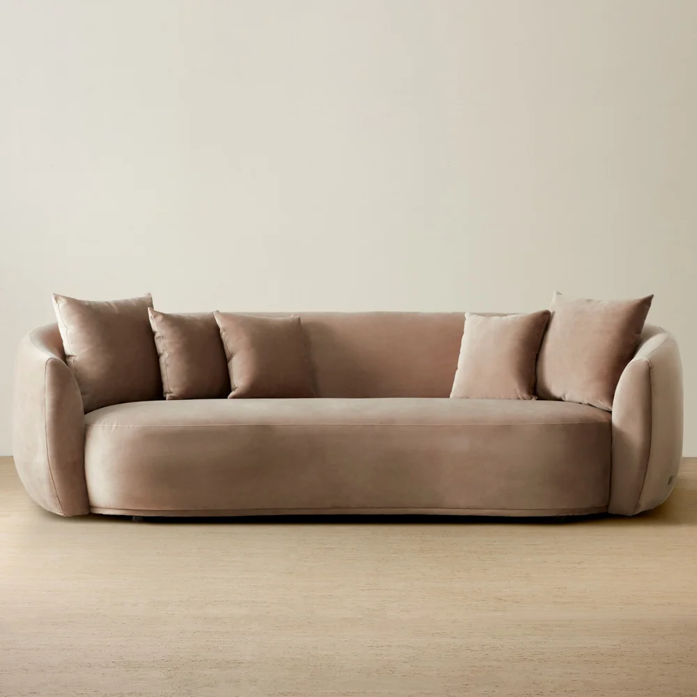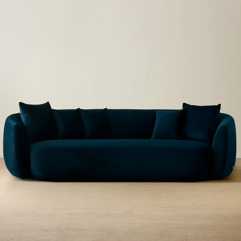 Its mid-century modern style showcases clean lines and subtle curves, with an inward curving frame that adds a unique touch, complemented by matching cushions in the same luxurious fabric.