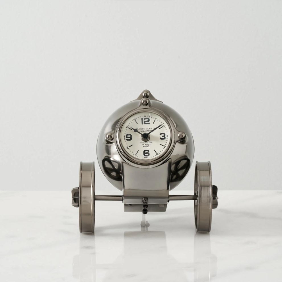 The Flaco Table Clock, echoing the iconic Dawson design, introduces a unique twist with its playful wheels, evoking memories of childhood toy trains and vintage timepieces. Though compact in stature, it radiates an undeniable presence in its rich black nickel finish. Each detail, from its dark lustrous hue to its quirky design elements, has been meticulously crafted, making it not just a tool for timekeeping but a bona fide conversation starter.