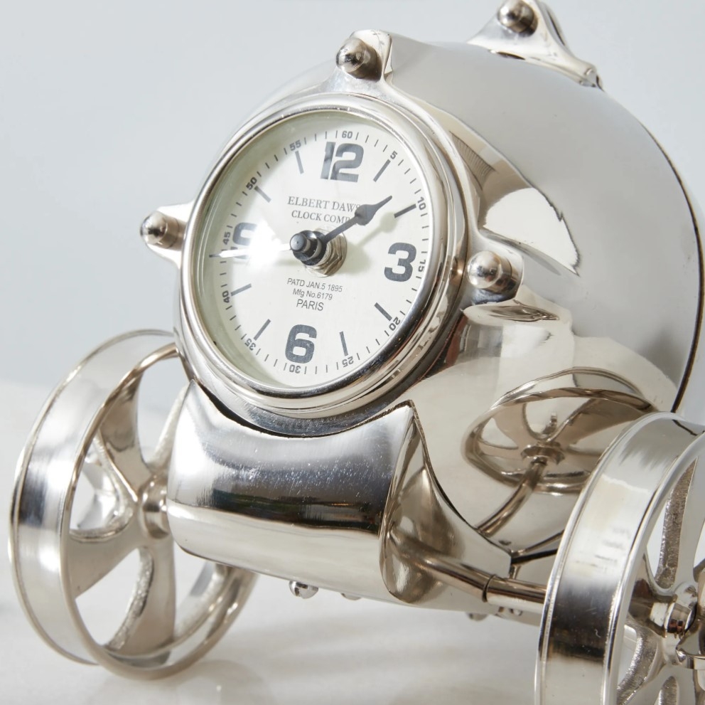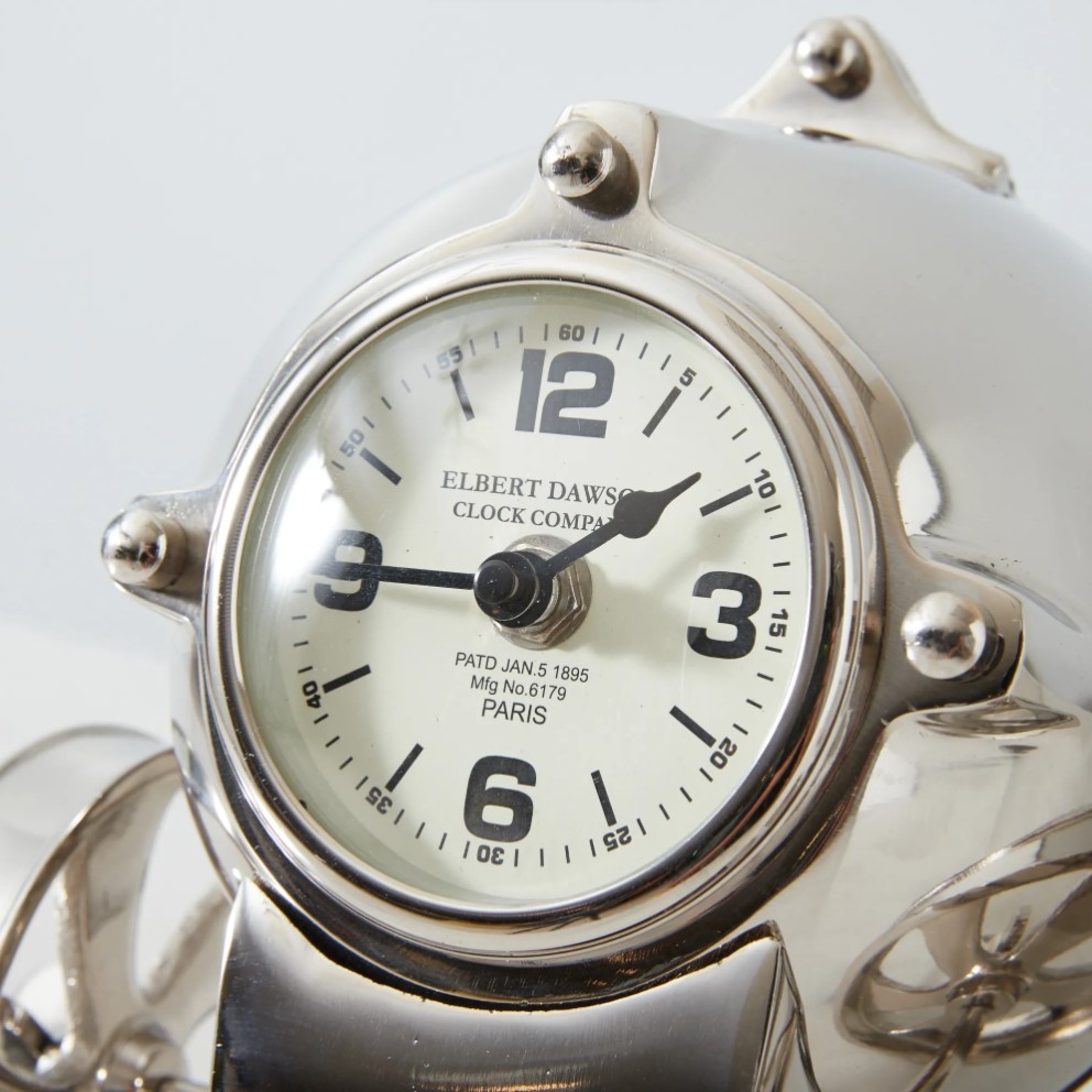The Flaco Table Clock, with its echoes of the iconic Dawson design, brings a unique twist with its playful wheels, reminiscent of childhood toy trains and vintage timepieces. Though compact in size, it radiates a presence that's impossible to overlook. Each detail, from its gleaming nickel-plated finish to its quirky design elements, has been meticulously crafted to ensure it's not just a timekeeping instrument, but a conversation starter.