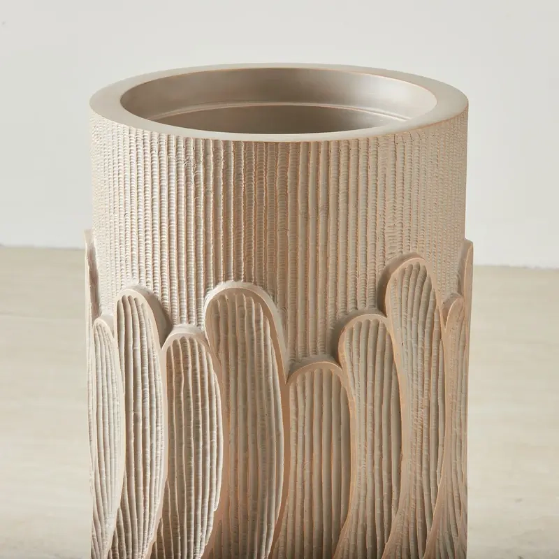 The Fermo Pearl and Antique Gold Vase showcases a dynamic wave-like design, blending textured curves with intricate detailing.