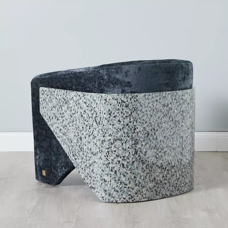 The Finn features a unique veneer wrap-around with a white, black, and blue terrazzo design that adds style and character. Its sturdy construction ensures stability, making it a distinctive occasional chair for any living room.