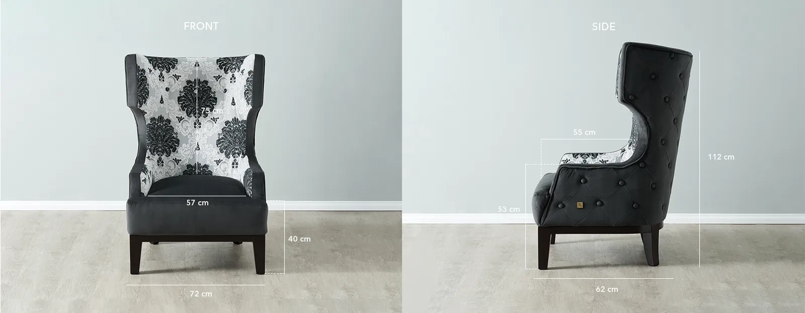 The Florence II Occasional Chair enhances the classic armchair design with a high-back frame featuring elegant curves. Upholstered in soft charcoal velvet with dense foam cushioning, it offers comfort and a refined look.