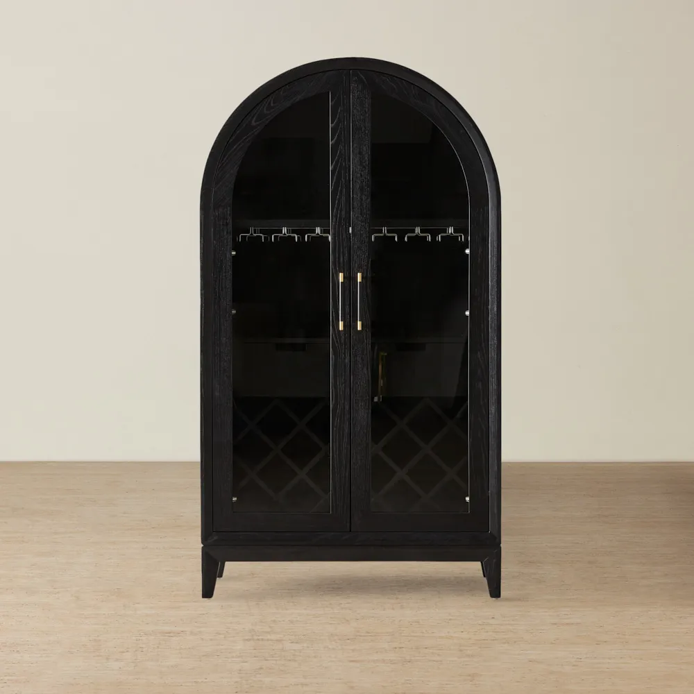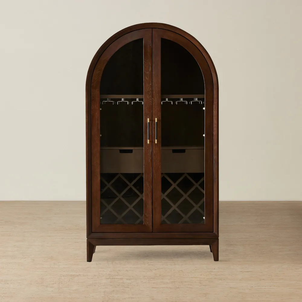 The Fredrik Brown Wooden Wine Display Cabinet stands as a testament to masterful craftsmanship and sophisticated design. Each piece of its rich, brown timber has been chosen for both beauty and durability, presenting a seamless blend of form and function. This elegance is further accentuated by its beautifully arched top, a balance between classic elegance and modern flair. The double glass paneled doors not only add an architectural touch but also serve as a window into the world of wines and spirits within, protecting while showcasing.