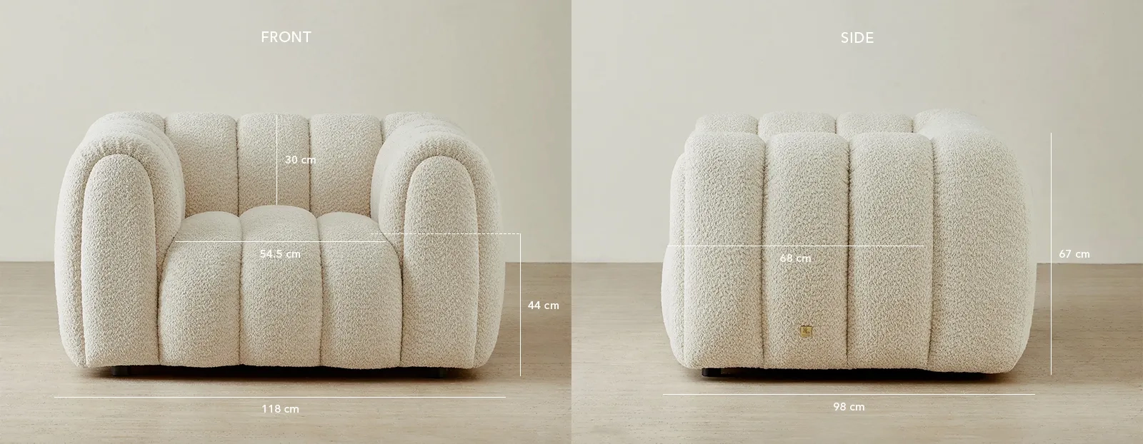 Thoughtfully cushioned, the Gabriella invites you to relax into its plush, cloud-like embrace. With gently curved wraparound arms and deep channelling, it offers a cosy, cocooning experience—ideal for reading, unwinding, or adding a stylish accent to your space.