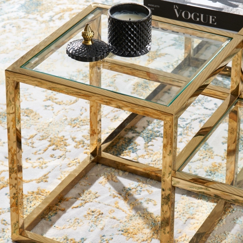The Geometric Coffee Table is a multileveled masterpiece made with a combination of premium quality metal and sturdy tempered glass. It features a total of 9 different tables with varying degrees of elevation, giving the piece flexibility for all your stylish choices.