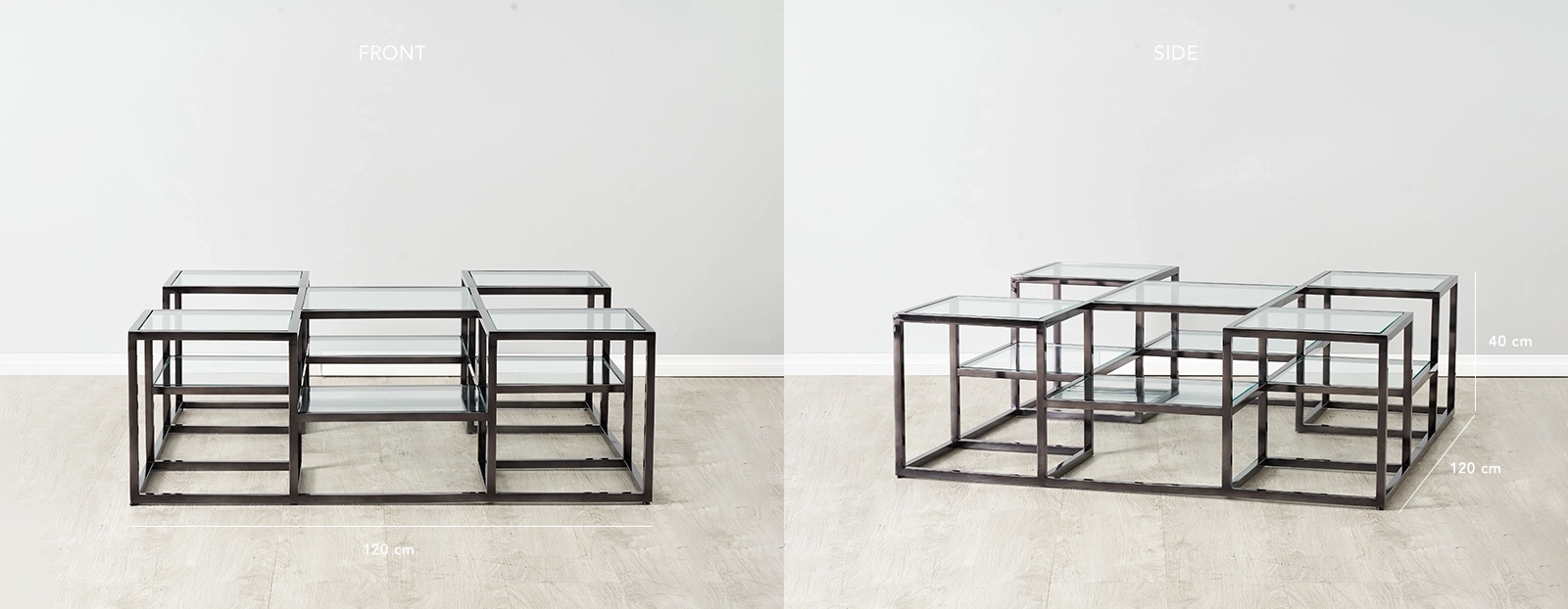 The Geometric Coffee Table features a multilevel design with nine interconnected tables made from stainless steel and glass. Its unique structure offers flexibility and adds a modern touch to any living space.