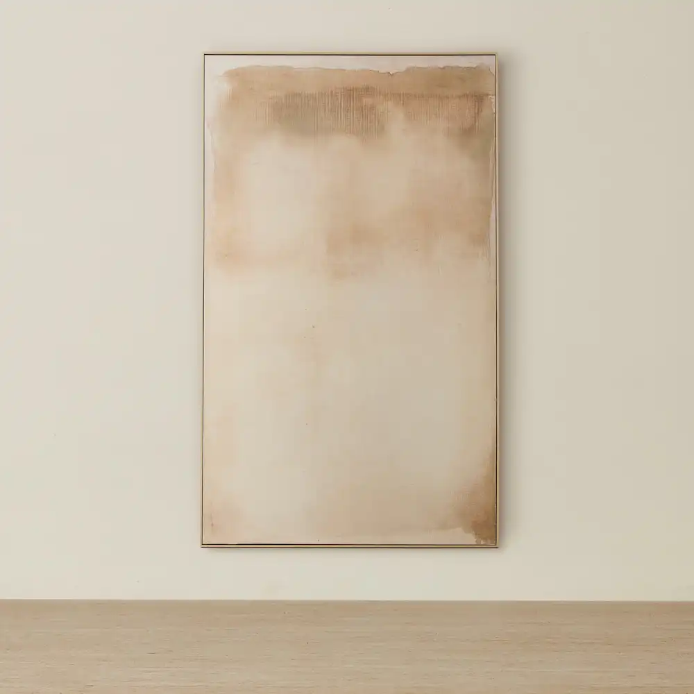 Golden Horizon moves through layers of warm beige and muted gold, with a subtle band of deeper tone settling across the upper canvas. The colours feel diffused and open, creating a gentle warmth that sits quietly within the space.