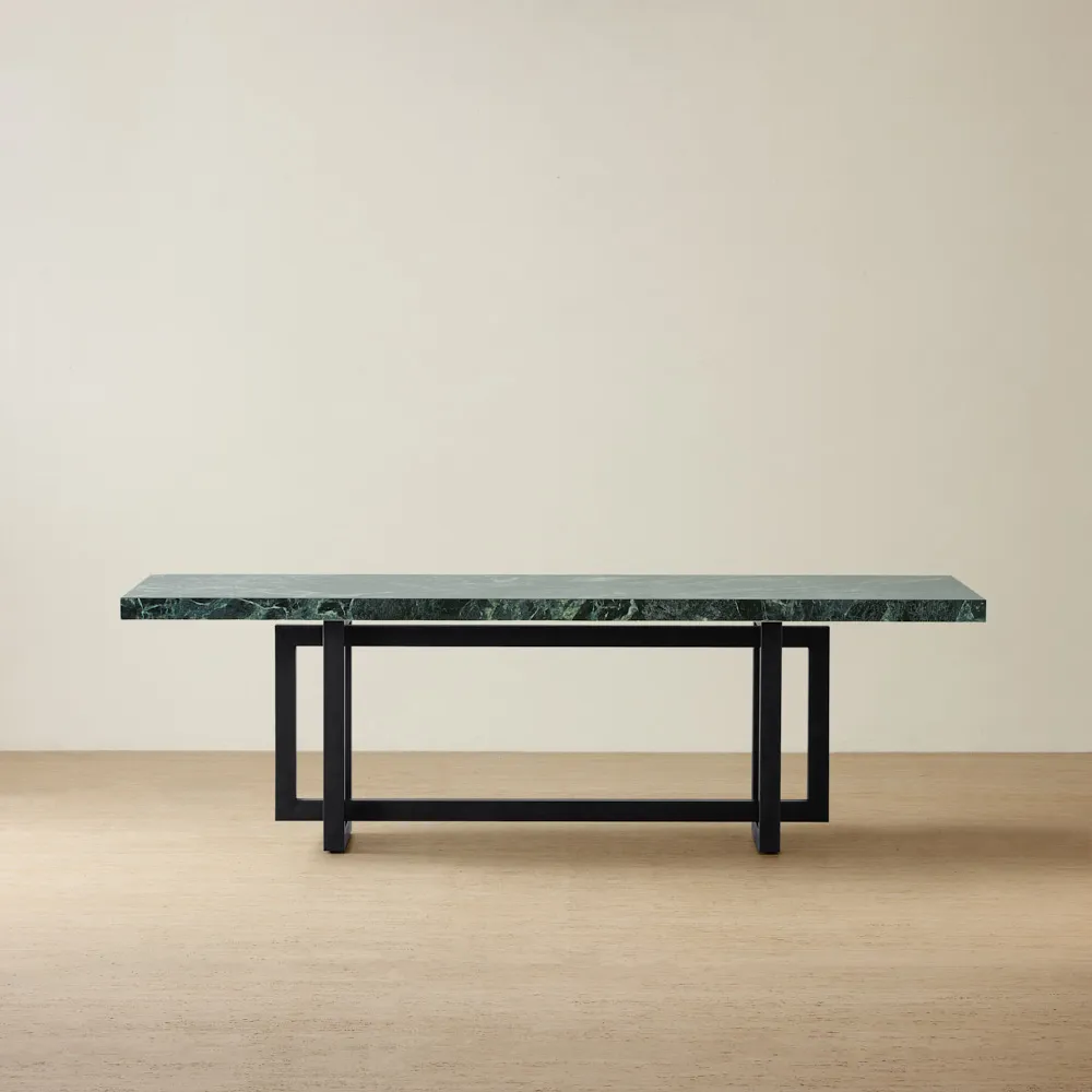 Its strong rectangular form rests on sculptural geometric legs, creating a foundation that is both striking and enduring. With its imposing scale and architectural elegance, this table becomes the centrepiece of any dining space.