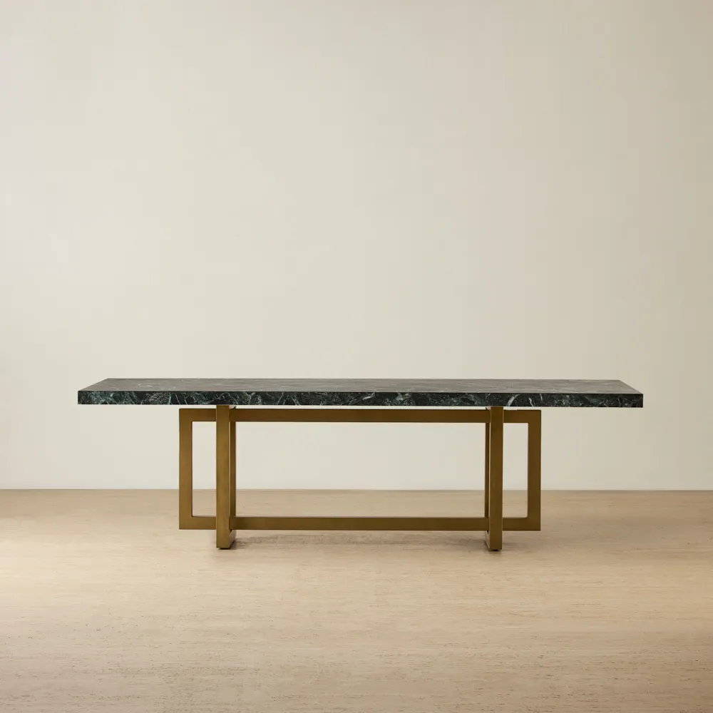 Its strong rectangular form rests on sculptural geometric legs, creating a foundation that is both striking and enduring. With its imposing scale and architectural elegance, this table becomes the centrepiece of any dining space.
