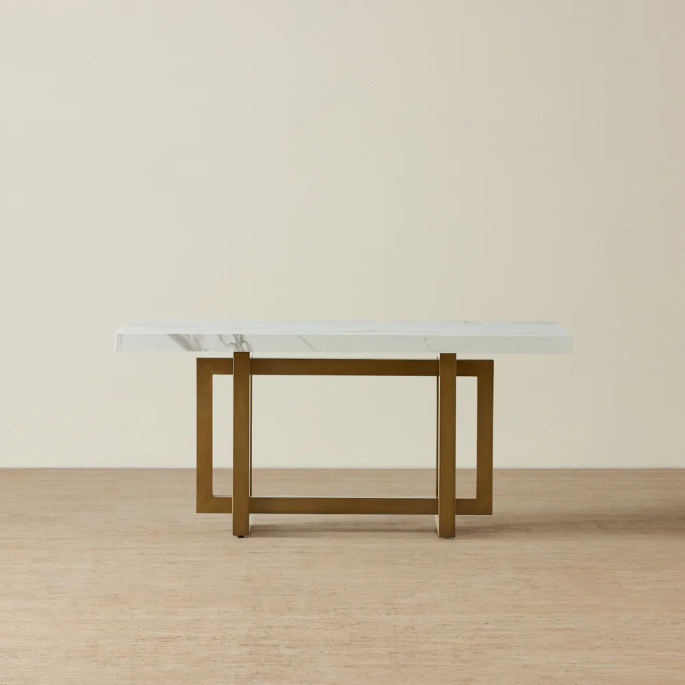 The Grayson Dining Table showcases a Statuario White sintered stone top, marked by graceful grey veining and a refined matte finish. Designed to seat up to six, it sets the stage for both relaxed everyday dining and intimate gatherings.
