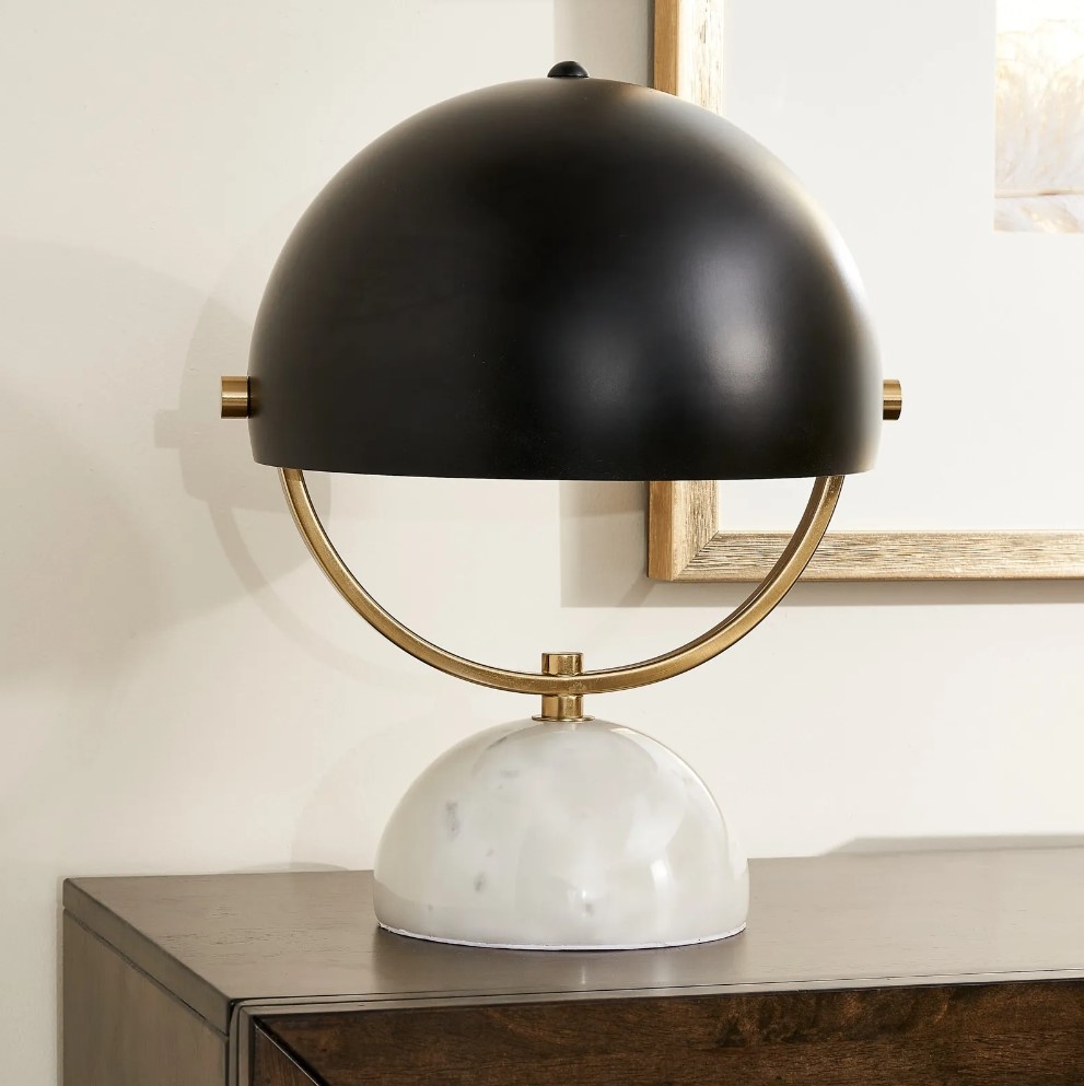 Dominating the upper half is a deep, black metal hemisphere that serves as a sanctuary for the bulb. This shade, with its smooth contours and matte finish, offers a stark, modern counterpoint to the ambient light it gently diffuses. Balancing this modern metal shade is the Gwen's true feature: a lower hemisphere crafted from pristine white marble.