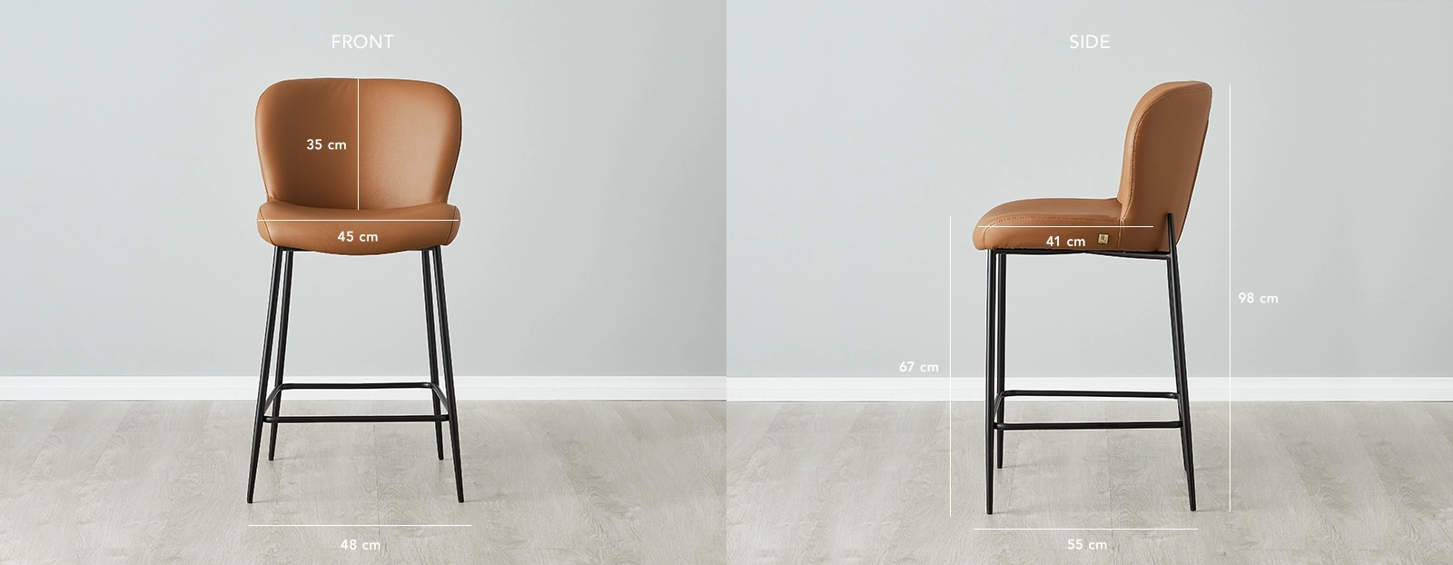 This Leather comes in a sophisticated Walnut shade, which adds to the Hailey's sophistication. Four gorgeously crafted metal legs seamlessly flow from the seat and are joined below the base to provide a helpful footrest for lengthy conversations. These legs come in a luxe black shade that accentuates their simplicity and beauty. The Hailey works best in a pair and comes in a wide variety of colours.