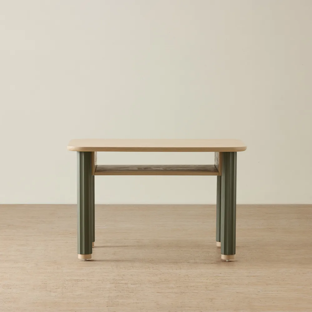 A single drawer with a simple knob holds favorites, while the open shelf below is ready for books, toys, or slippers. Ribbed sides add a playful touch to this sturdy piece made just for little rooms.