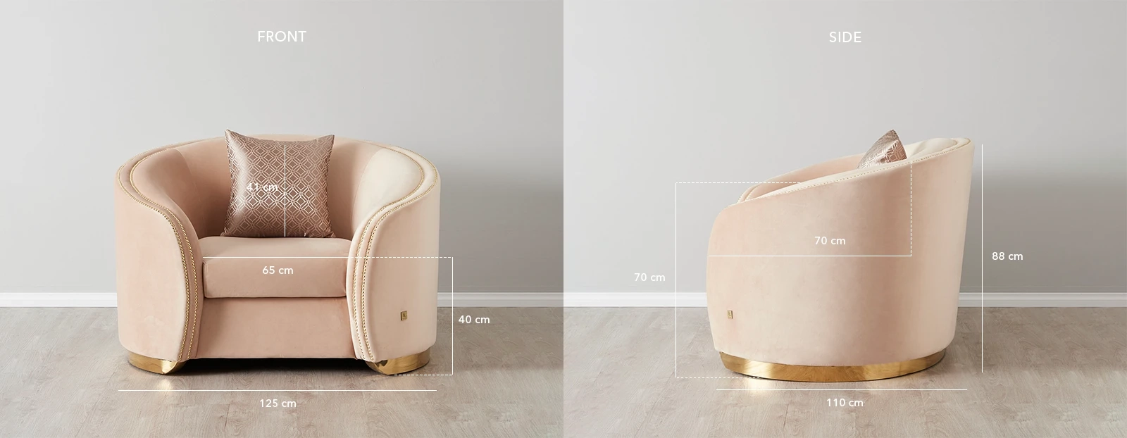 Adding to its luxuriousness is a row of golden beads that runs along the Harriet's outline. The presence of high-quality foam on the seat and backrests makes the piece extremely comfortable to lounge on for hours on end. A golden-coloured steel frame gorgeously decorates the Harriet's lower area and provides ample support for the whole piece. With unparalleled style and functionality, The Harriet Chair is a worthy centrepiece for any living room.