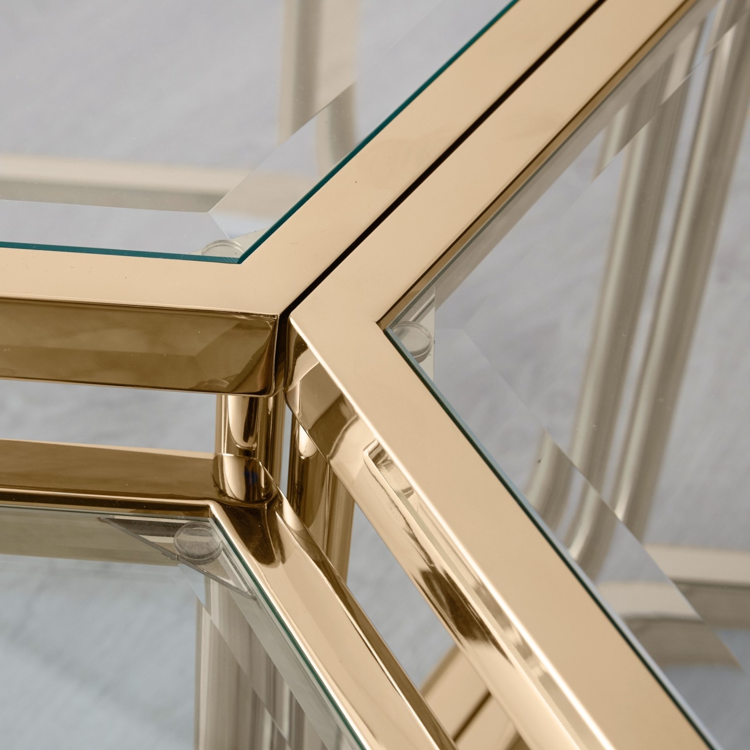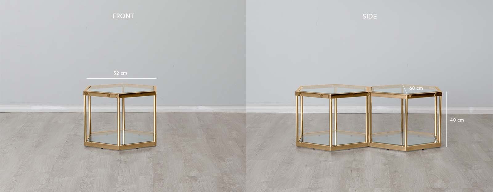 The Hexagonal Golden Side Table gives living rooms a unique and stylish look. Admire its majesty from all sides as it's constructed in a transparent three-dimensional design. This beautiful piece is made with high-quality stainless steel and tempered glass. Its tempered glass tabletop makes for great display areas for books, figurines and more.