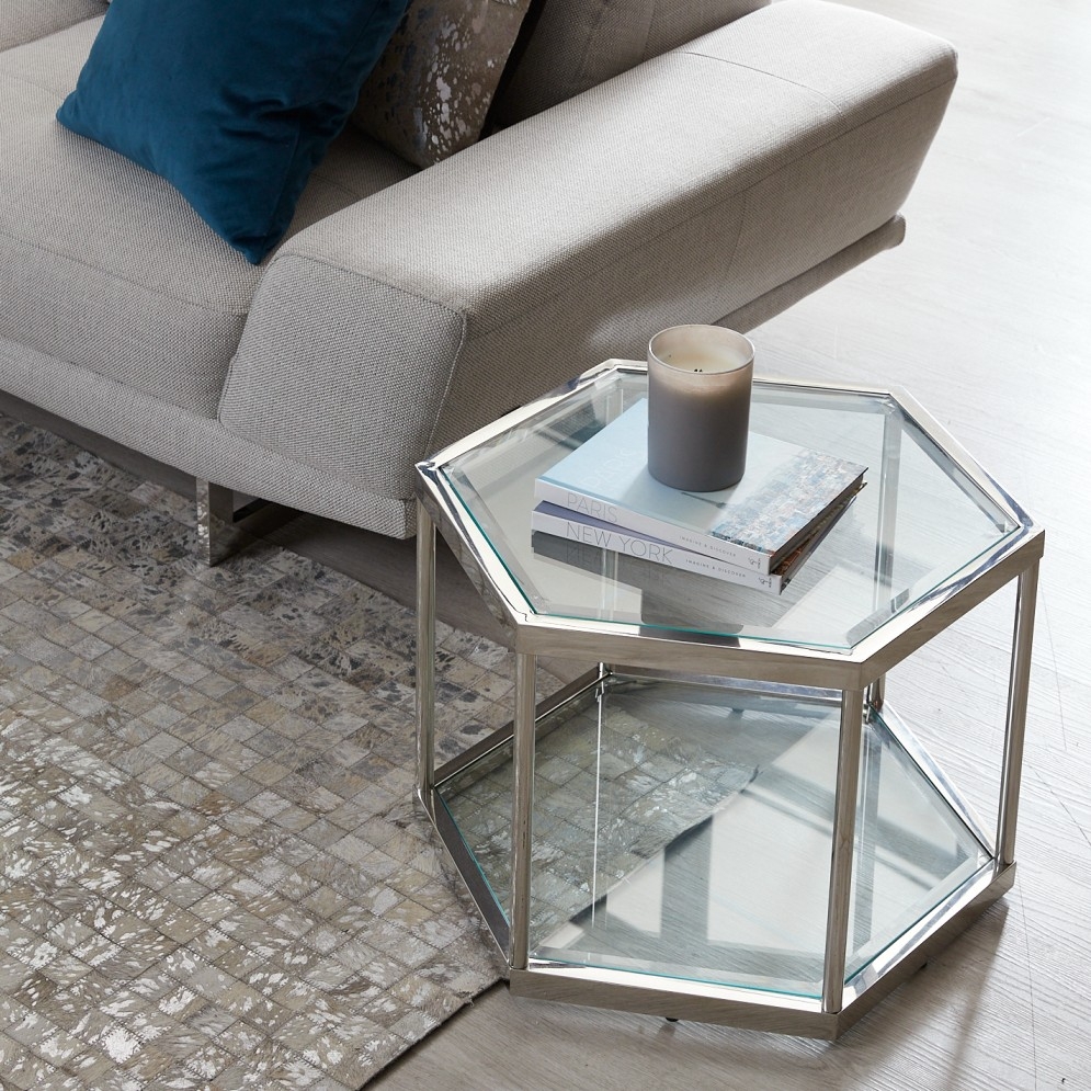 The Hexagonal Side Table gives living rooms a unique and stylish look. Admire its majesty from all sides as it's constructed in a transparent three-dimensional design. This beautiful piece is made with high-quality stainless steel and tempered glass. Its tempered glass tabletop makes for great display areas for books, figurines and more.