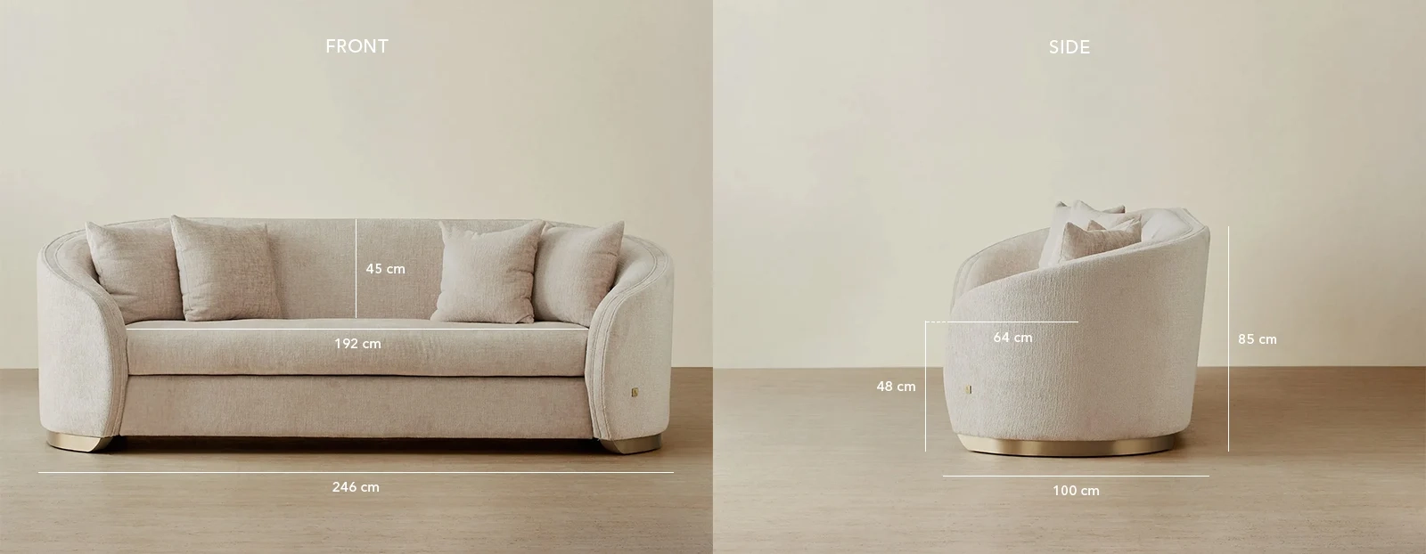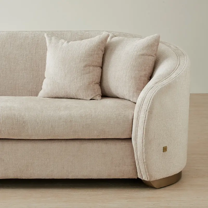 The Hyacinth Sofa offers a curved, modern design with soft chenille fabric for comfort. Its seamless silhouette provides generous seating space for three.