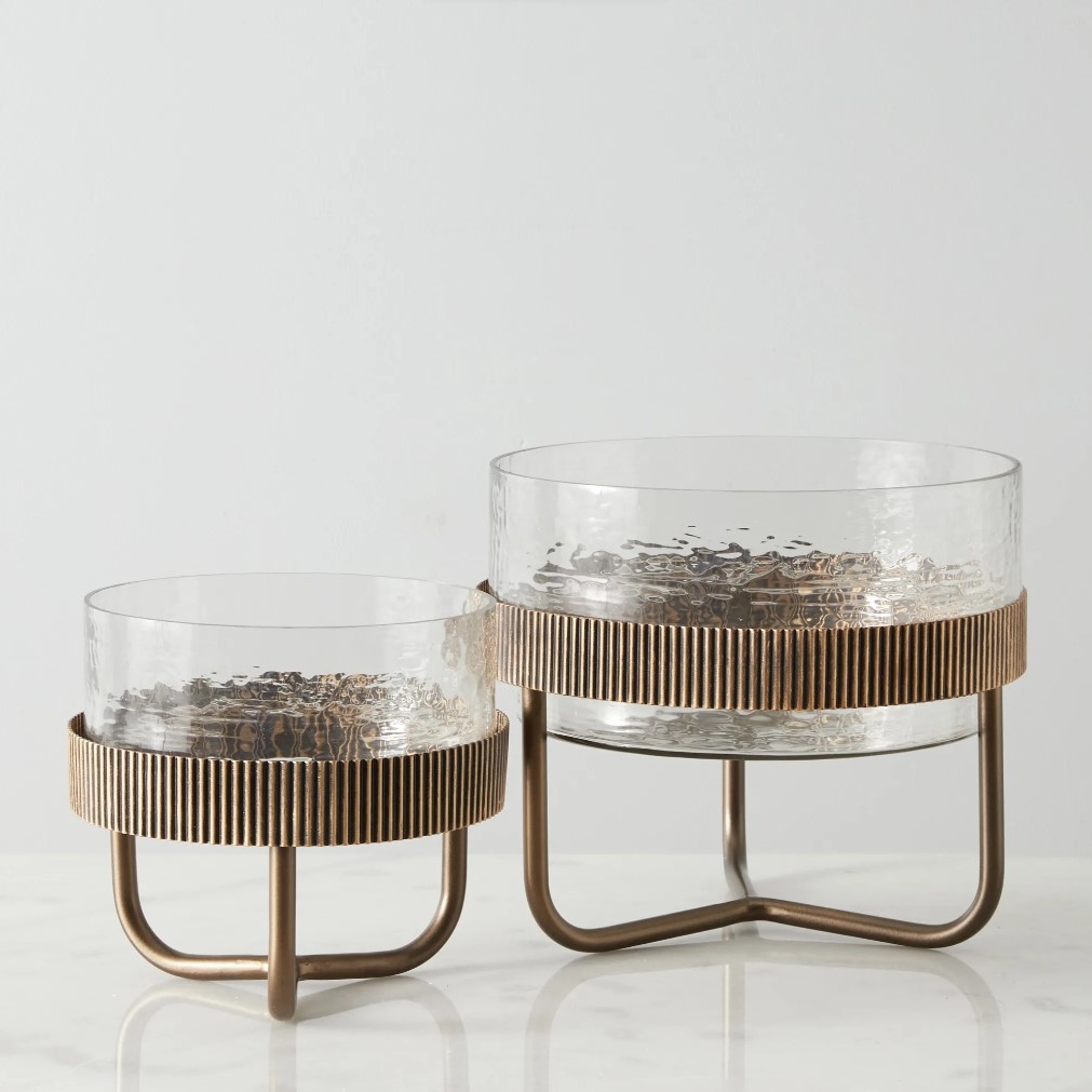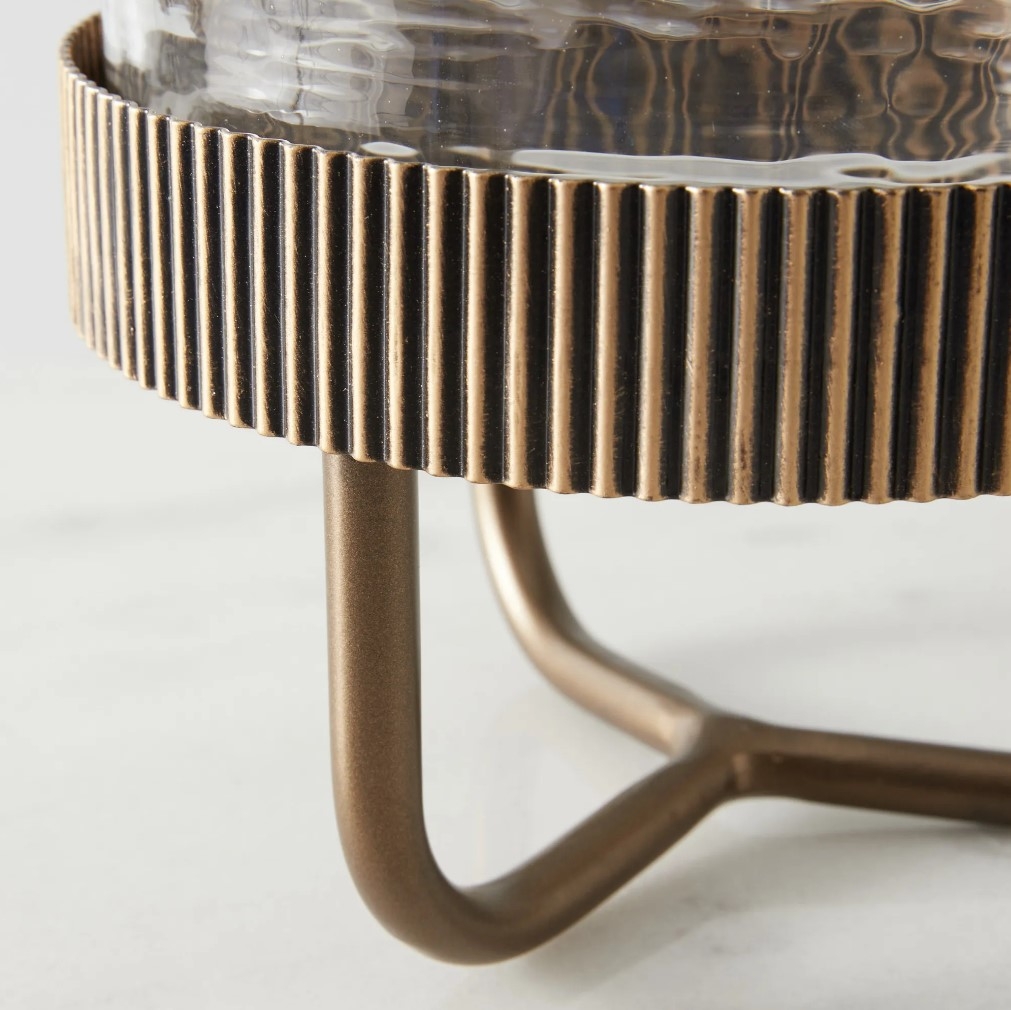 At the heart of its design is the beautifully crafted circular bowl, made from hammered glass. This design choice not only adds texture but also captures light in such a way that whatever resides within is highlighted with a soft glow. Nestled within this glass masterpiece is the bowl's supporting star: its dark gold matte metal body.