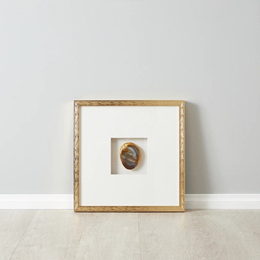 The organic patterns of the agate infuse any space with an air of mystery, while the minimalist design of the shadow box maintains a modern and sophisticated aesthetic. The gold frame not only adds a touch of luxury but also beautifully complements the mesmerizing hues within the agate.