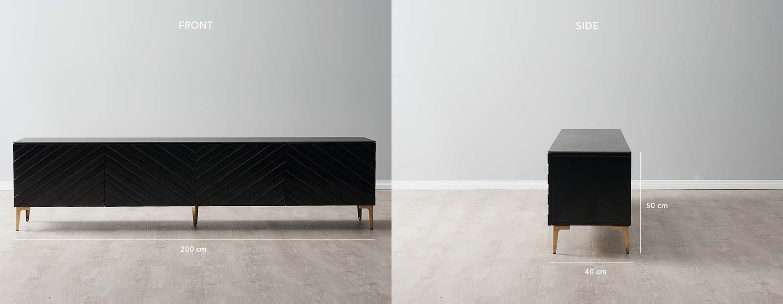 Fill your living room with supreme elegance and modernity with the Isaac Entertainment Unit. This modern work of art commands attention with its stylish design and all-black colours. Its sleek and modern design will look splendid when paired with your TV screen or other media devices. The Isaac features a gorgeous top panel made from exquisite marble designed with grey and copper-coloured veins that run along its outline.