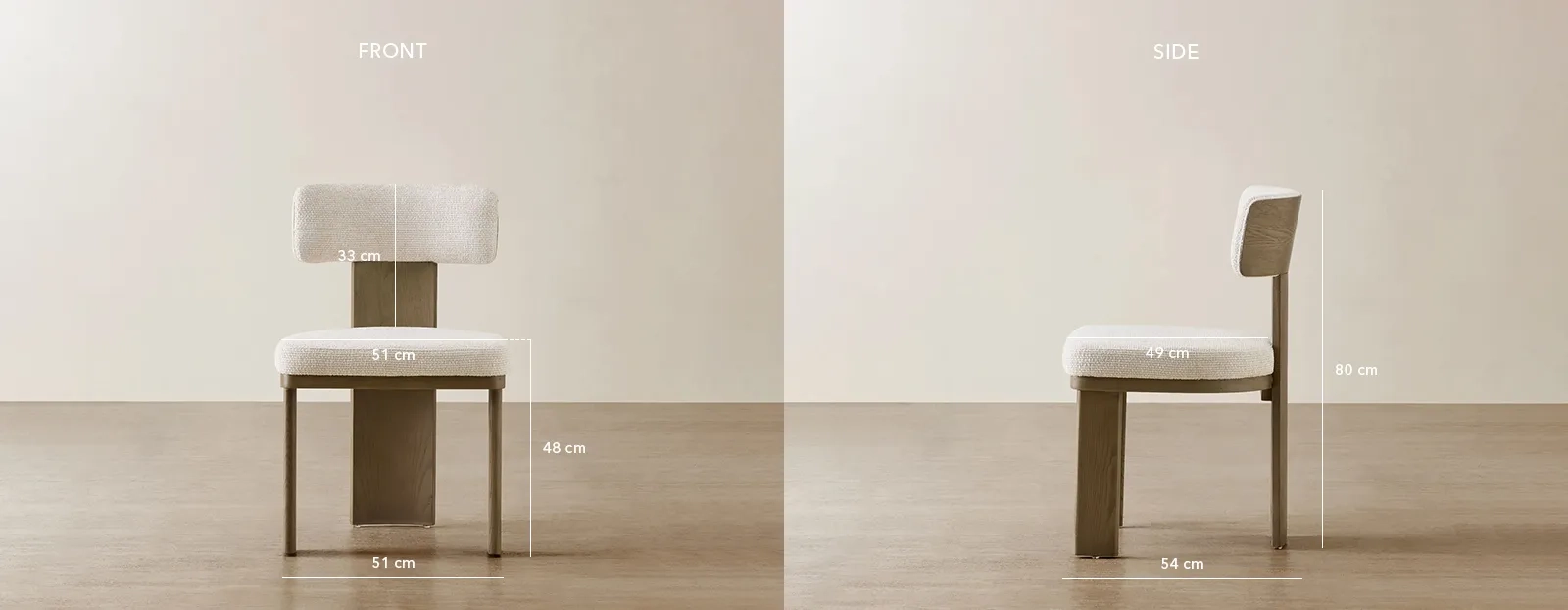The Isadora Dining Chair embraces simplicity through thoughtful form and material. Its warm ivory fabric wraps softly around a structured silhouette, creating a gentle contrast between comfort and precision.