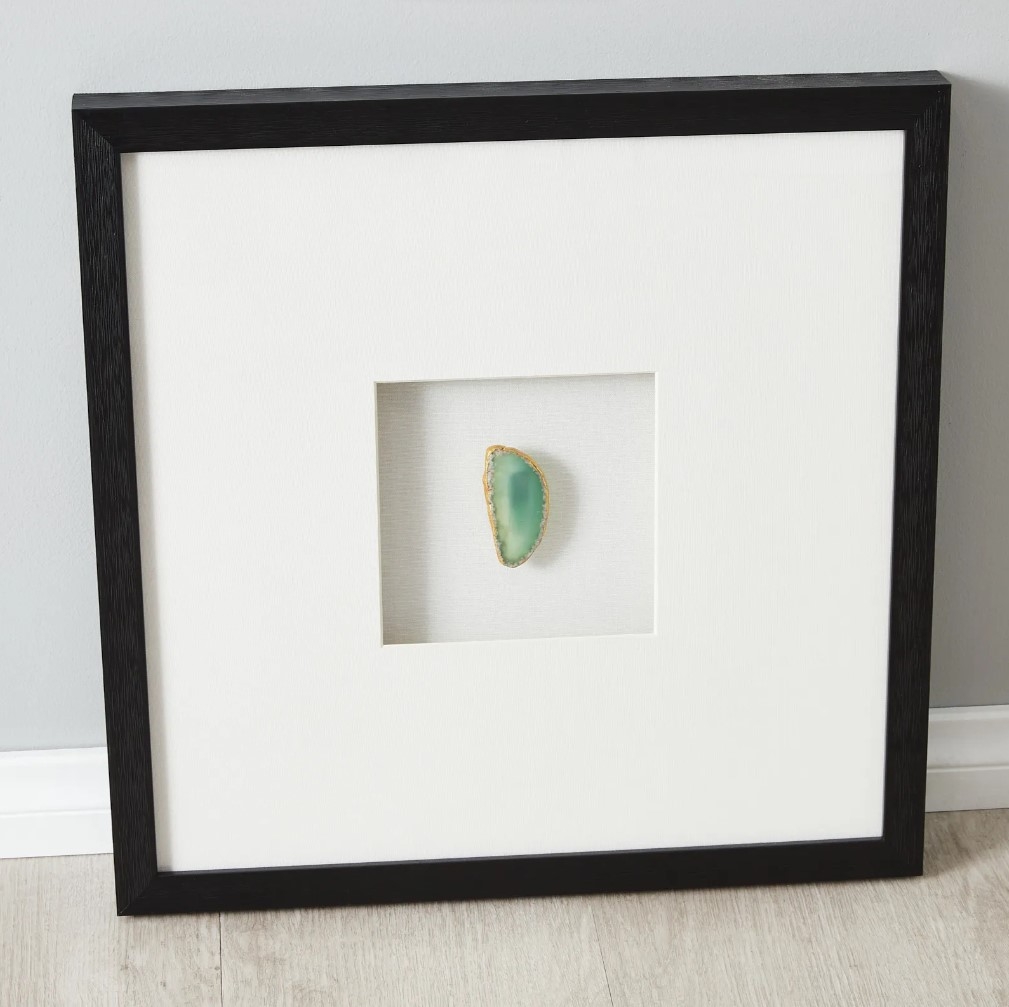 The organic patterns of the agate infuse any space with the soul of nature, while the minimalist design of the shadow box maintains a modern and sophisticated aesthetic. The black frame not only adds a touch of elegance but also strikingly contrasts the verdant hues within the agate.