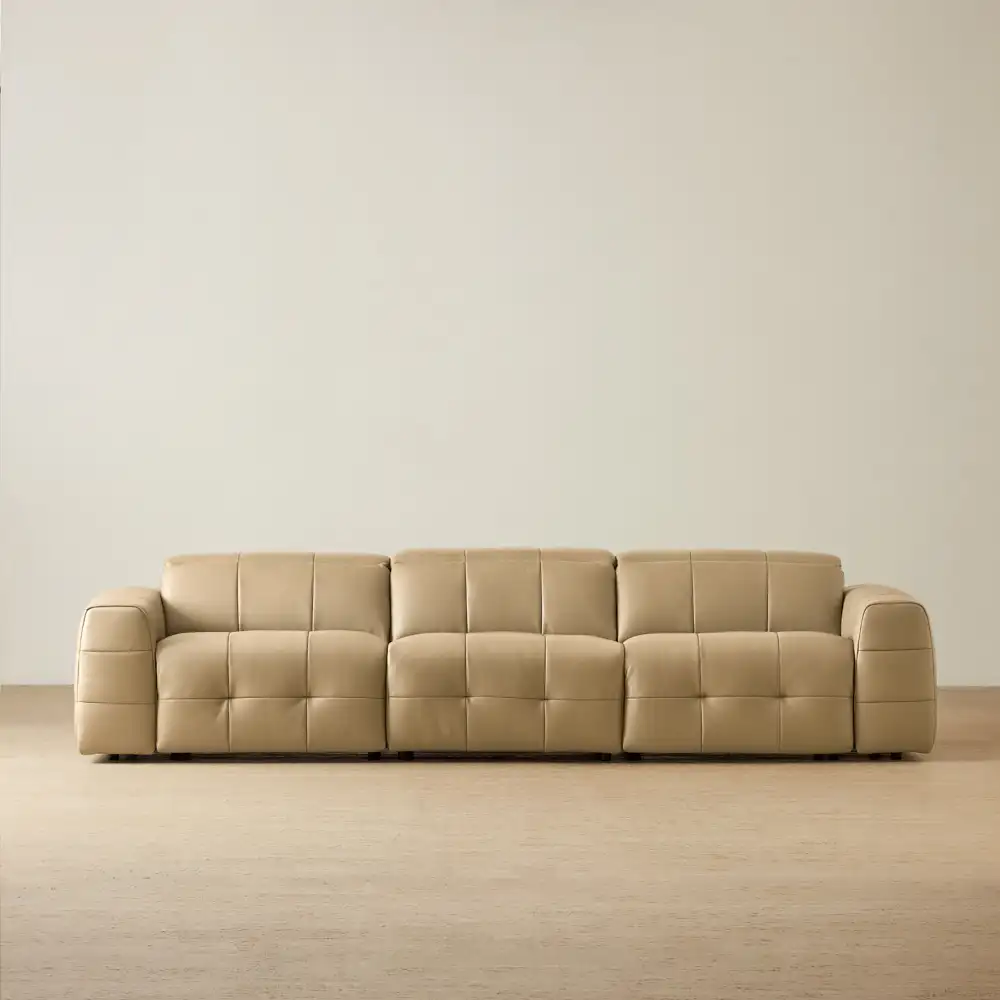 The Jones Modular Recliner is wrapped in desert brown leather, a rich tone that carries warmth and depth across its tailored surface. Subtle tufted detailing shapes the seats and backrests, giving the silhouette an architectural rhythm.
