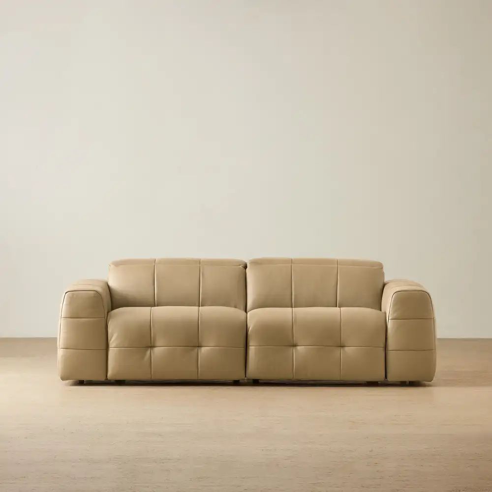 The Jones Modular Recliner is wrapped in mushroom beige leather that feels smooth to the touch and brings a soft warmth to the room. Its wide, cushioned shape creates an inviting silhouette, built for sinking in and switching off.