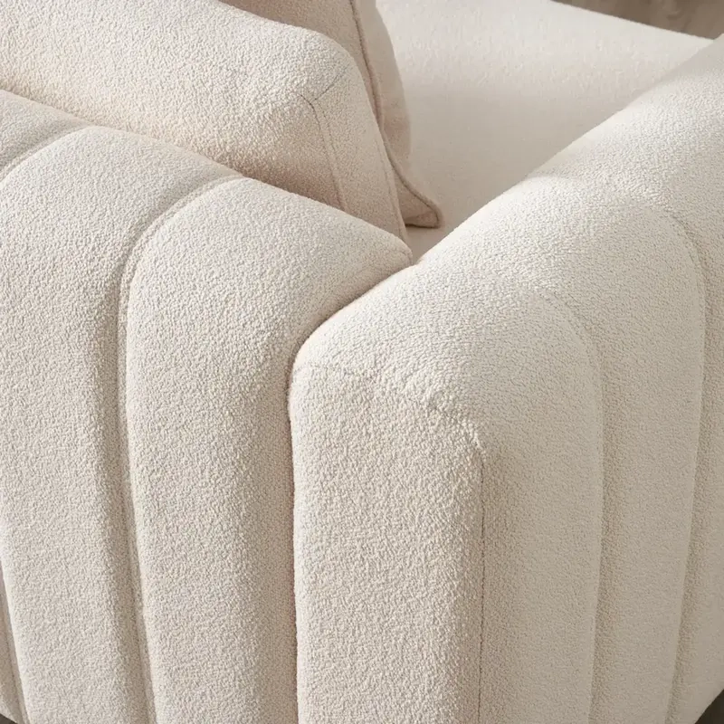 With a structured tuxedo-inspired silhouette, The Jordan is upholstered in soft fabric, offering a light and sophisticated aesthetic. The two connected pieces create a stylish and functional seating area, perfect for modern living rooms.